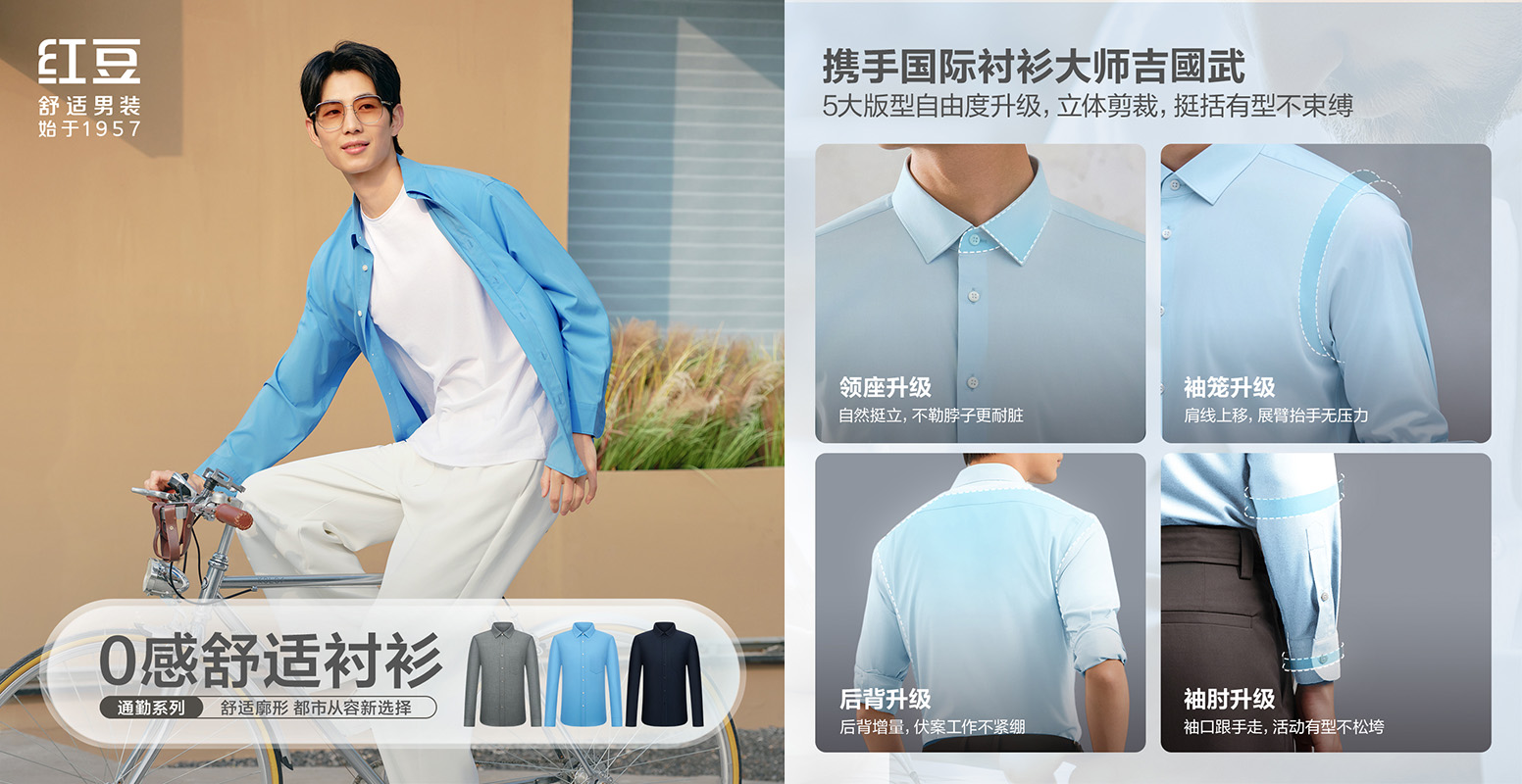 2025年,聯(lián)合國際襯衫大師吉國武共同打造的匠心之作紅豆0感舒適襯衫3.0,對(duì)Flexpand版型進(jìn)行了四大升級(jí)。拱橋型領(lǐng)口解放頸部,活動(dòng)無束且更耐臟;通過肩線上移與后背增量設(shè)計(jì),實(shí)現(xiàn)抬手自如,大幅提升活動(dòng)靈活性;肘部特殊褶裥處理,保障伏案工作時(shí)毫無緊繃感;自貼合袖口能隨手腕活動(dòng)自動(dòng)調(diào)節(jié),時(shí)刻保持最佳狀態(tài)。