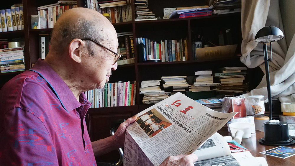 7月29日,今年的七夕前夕,當代著名老詩人、作家、文藝評論家丁芒在家中認真錄制著對紅豆七夕節(jié)20周年的祝福視頻。中國當代詩壇曾有“北臧南丁”之說。丁芒,這位從南通城走出來的大詩人,從抗日戰(zhàn)爭的烽火開始生命的吟唱,80載筆墨為伴,書寫了萬余首激蕩人心的詩篇。面對記者的拜訪,丁芒和其夫人都十分熱情。現(xiàn)已96歲高齡的他,看起來依舊面色紅潤,精神飽滿。在丁芒老先生家中,能夠感受到濃濃的文化氣息,書柜上、書桌上擺滿了各種書籍。雖然已是耄耋之年,丁芒老先生依然每天以書籍為精神食糧,在他的身上,我們看到了一個詩人對詩詞的忠貞和熱愛,對傳統(tǒng)文化的敬畏和崇拜。