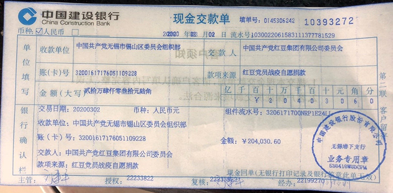 眾志成城,方能共克時艱,為響應黨中央、省委、市委、區委對廣大黨員的號召,助力全國共抗疫情,紅豆集團廣大黨員干部迅速行動,踴躍捐款,用愛心凝聚合力,表達對新冠肺炎疫情防控工作的支持,到2月29日,紅豆的1235名黨員僅僅用了不到一天的時間,自愿捐款總金額達204030.6元。早在1月30日,剛從國外出差回來的紅豆集團黨委書記、董事局主席兼CEO周海江就通過錫山區委組織部向無錫市委組織部交納1000萬元特殊黨費用于助力疫情防控。這次捐款他又是第一個行動,積極作表率。疫情防控沒有局外人,黨員干部們一致表示,在這個特殊時期,大家必須行動起來,既然不能到一線抗擊疫情,就要在本職崗位上為疫情防控盡一份綿薄之力。