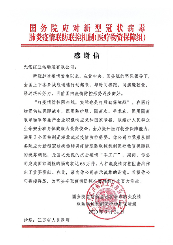這是3月24日,紅豆集團(tuán)下屬的紅豆運(yùn)動裝公司收到國務(wù)院應(yīng)對新型冠狀病毒肺炎疫情聯(lián)防聯(lián)控機(jī)制醫(yī)療物資保障組的感謝信中的一段話。